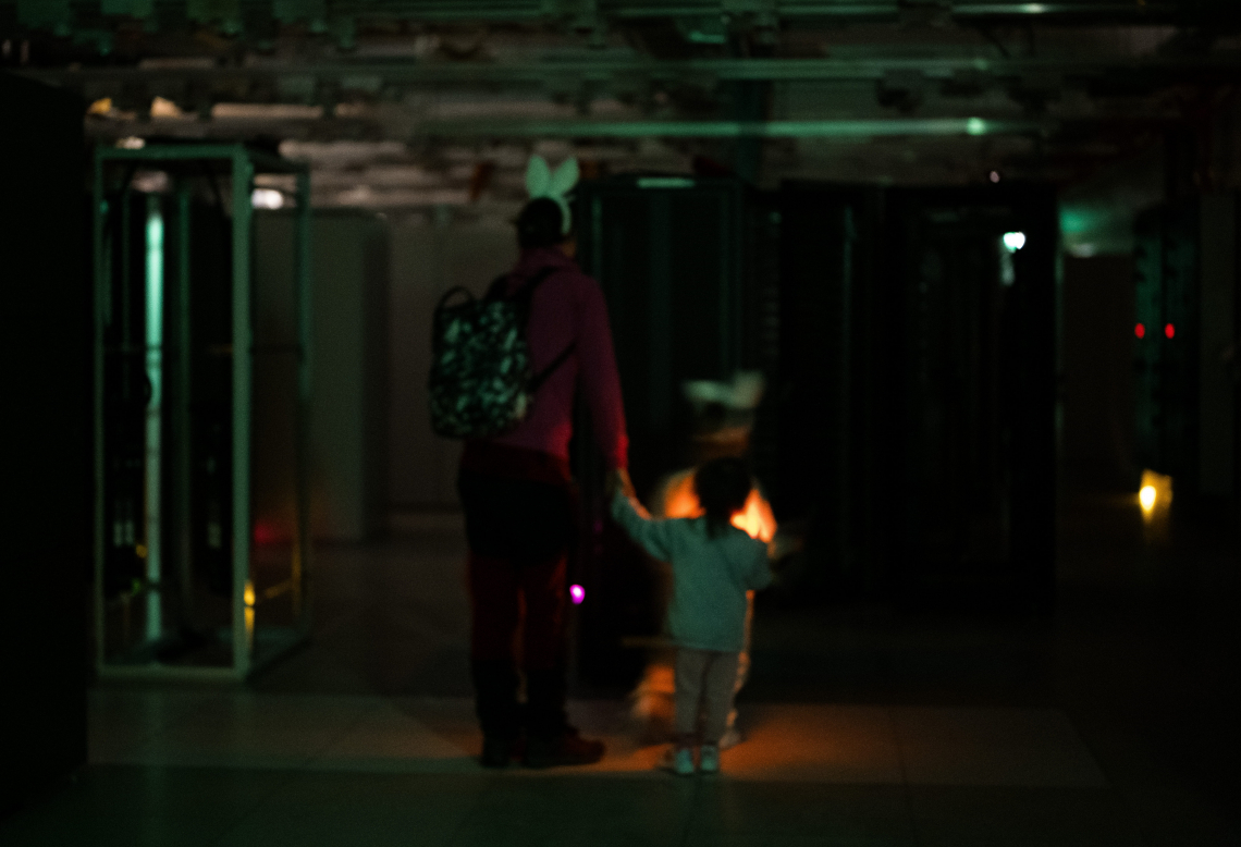 Kampuksen munajahti vie osallistujat sellaisiin paikkoihin, joihin normaalisti vain harvalla on pääsy. Kuvassa etsitään pimeässä hohtavia pääsiäismunia konesalista.